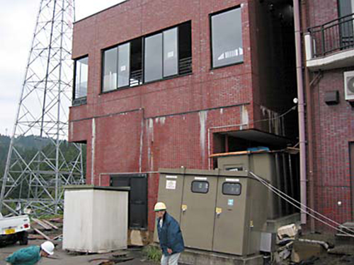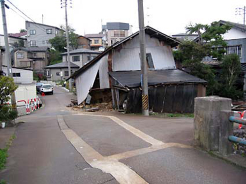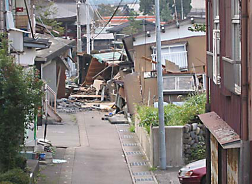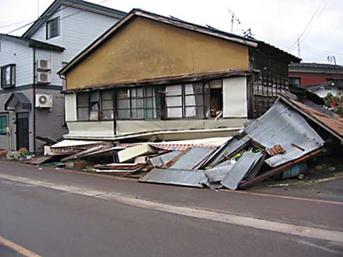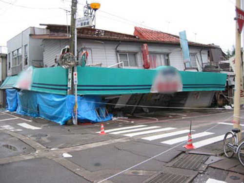 小千谷市本町2丁目の土蔵の倒壊 内部が土蔵 市街部では木造住家のみ被害地域であっても土蔵は高率で被害を受けている(卓越周期の関係)