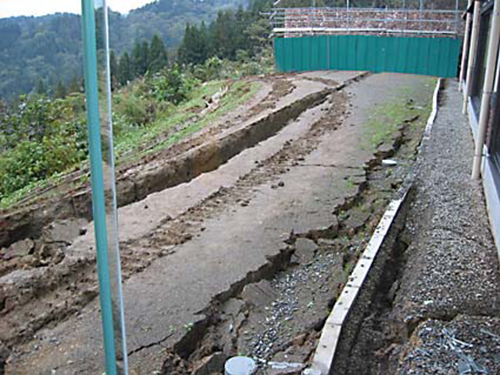 小千谷市土川2丁目弥生団地 旧流路埋積堆積物と盛土地盤の側方流動 住家ごと傾いていている